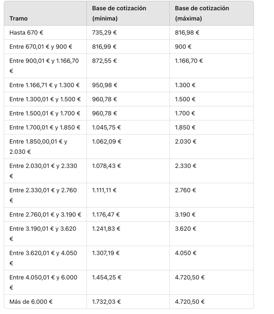 A cada uno de estos tramos se le asigna una base de cotización mínima y máxima, que permite determinar la cuantía de la cuota que el autónomo debe pagar. A continuación, se presenta la tabla con los tramos, así como las bases de cotización mínima y máxima correspondientes para el año 2024: